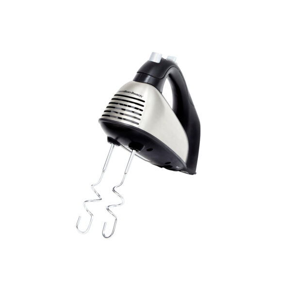 La batidora Hamilton Beach de 290 W tiene cuerpo de acero inoxidable cepillado y cuenta con un control de 6 velocidades con botón Quick Burst™ que aumenta la potencia de la batidora, botón para eyección de batidores, y su propia caja de almacenamiento a presión para un fácil guardado. Además, incorpora un completo set de accesorios: batidores tradicionales, gancho de masa y batidor globo.