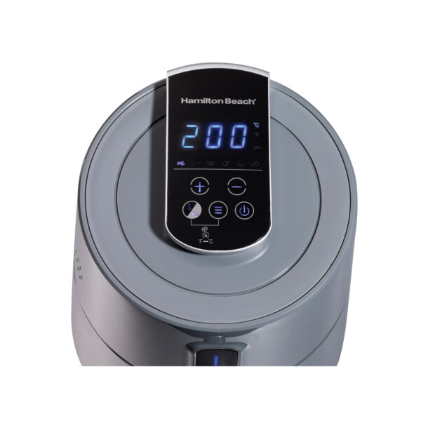 La freidora de aire Hamilton Beach con gran capacidad de 2,5 L, luz indicadora de funcionamiento, botón de desbloqueo de canasto, panel digital con 6 funciones preprogramadas de cocción, canasta removible antiadherente para fácil limpieza, asa fría al tacto y potencia de 1.400 watts.