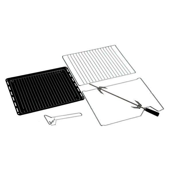 - 1 rejilla, 1 bandeja, 1 rejilla bandeja, 1 asa para tomar parrillas y bandejas, 1 rotisserie.