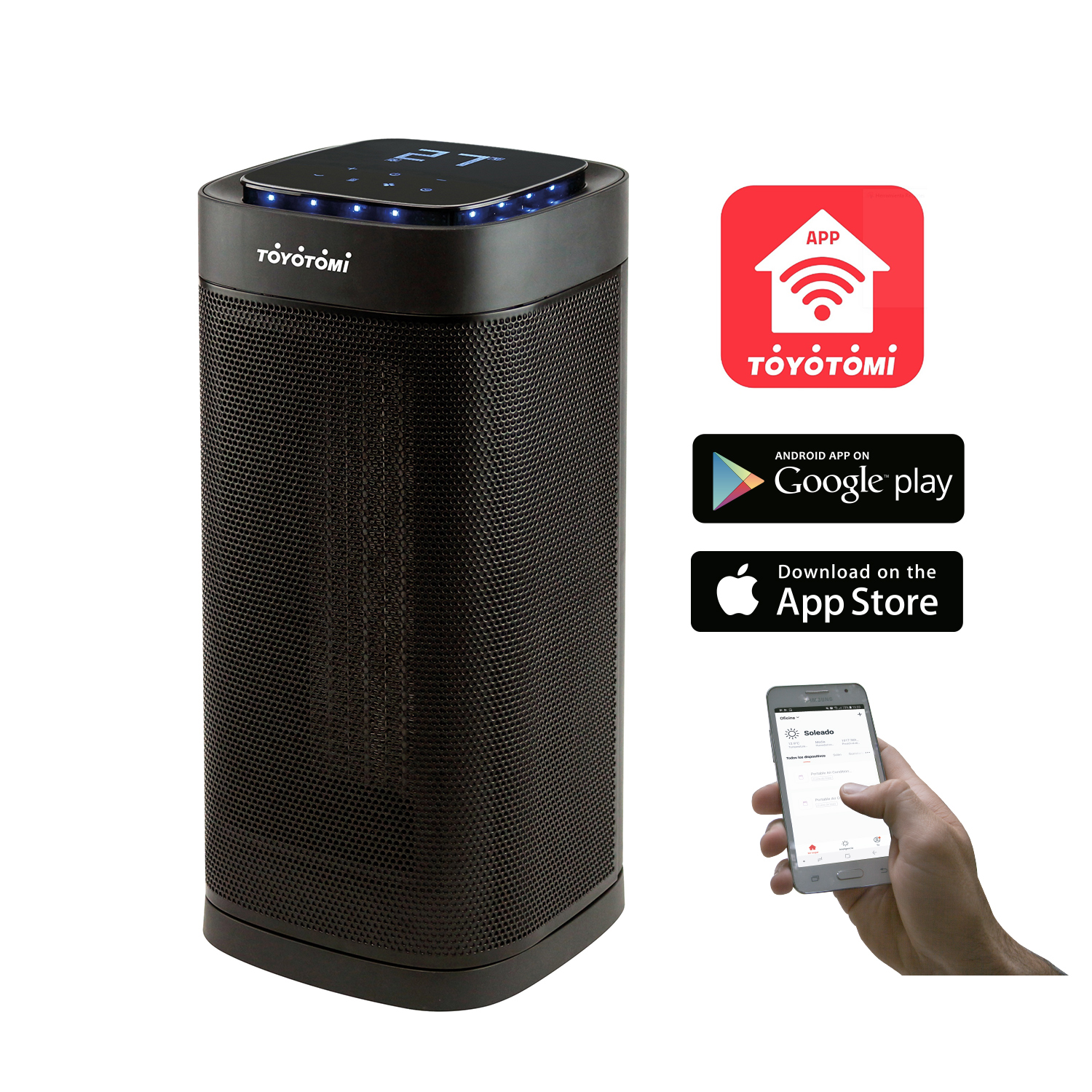 Además, cuenta con: Oscilación lateral, timer, apagado de seguridad por sobrecalentamiento, sensor de seguridad de volcamiento, 2 niveles de potencia, panel digital.Este equipo puede ser controlado a través del control remoto que viene incorporado o mejor aún con la App OZOM 2.0, con lo cual podrás controlar el producto desde la comodidad de tu SmartPhone y/o Tablet. Es simple, es OZOM.